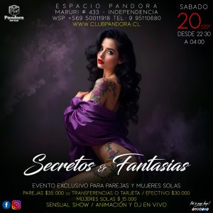SABADO 20 , UNA NOCHE DE *SECRETOS & FANTASIAS* EVENTO EXCLUSIVO PARA PAREJAS Y MUJERES SOLAS , HAZ TU RESERVA SOLO EN NUESTRO WSP +56950011918