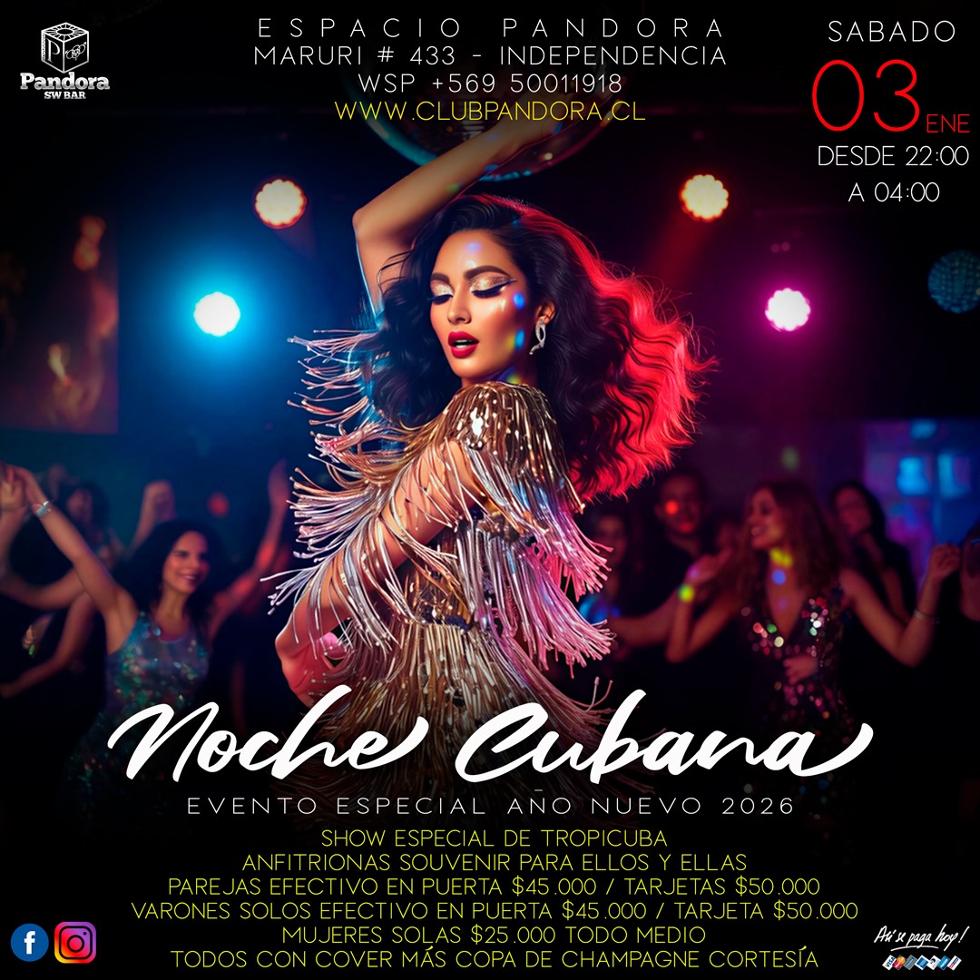 PANDORA CLUB BAR DA LA BIENVENIDA AL 2026 CON UN EVENTO ESPECIAL TEMATICO , UNA NOCHE LLENA DE SENSUALIDAD , RITMO Y SABOR CARIBEÑO, LOS ESPERAMOS A PARTIR DE LAS 22 HORAS CON NUESTRA FIESTA * NOCHE CUBANA + reservas solo a través de nuestro wsp +56950011918
