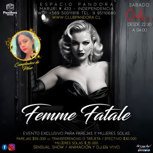 SABADO 4 EVENTO EXCLUSIVO PARA PAREJAS Y MUJERES SOLAS UNA NOCHE ESPECIAL * FEMME FATALE* HAZ TU RESERVA SOLO EN NUESTRO WSP +56950011918 TE ESPERAMOS APARTIR DE LAS 22,30