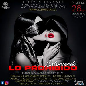 VIERNES 26 , UNA NOCHE ESPECIAL PARA PAREJAS , SOLOS Y SOLAS , TE ESPERAMOS CON * SABOREANDO LO PROHIBIDO* HAZ TU RESERVA SOLO EN NUESTRO WSP +56950011918