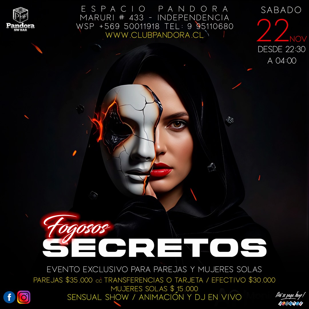 SABADO 22 , PANDORA CLUB BAR UNA NOCHE DE * FOGOSOS SECRETOS * EVENTO EXCLUSIVO PARA PAREJAS Y CHICAS SOLAS , RESERVAS SOLO A TRAVES DE NUESTRO WSP +56950011918