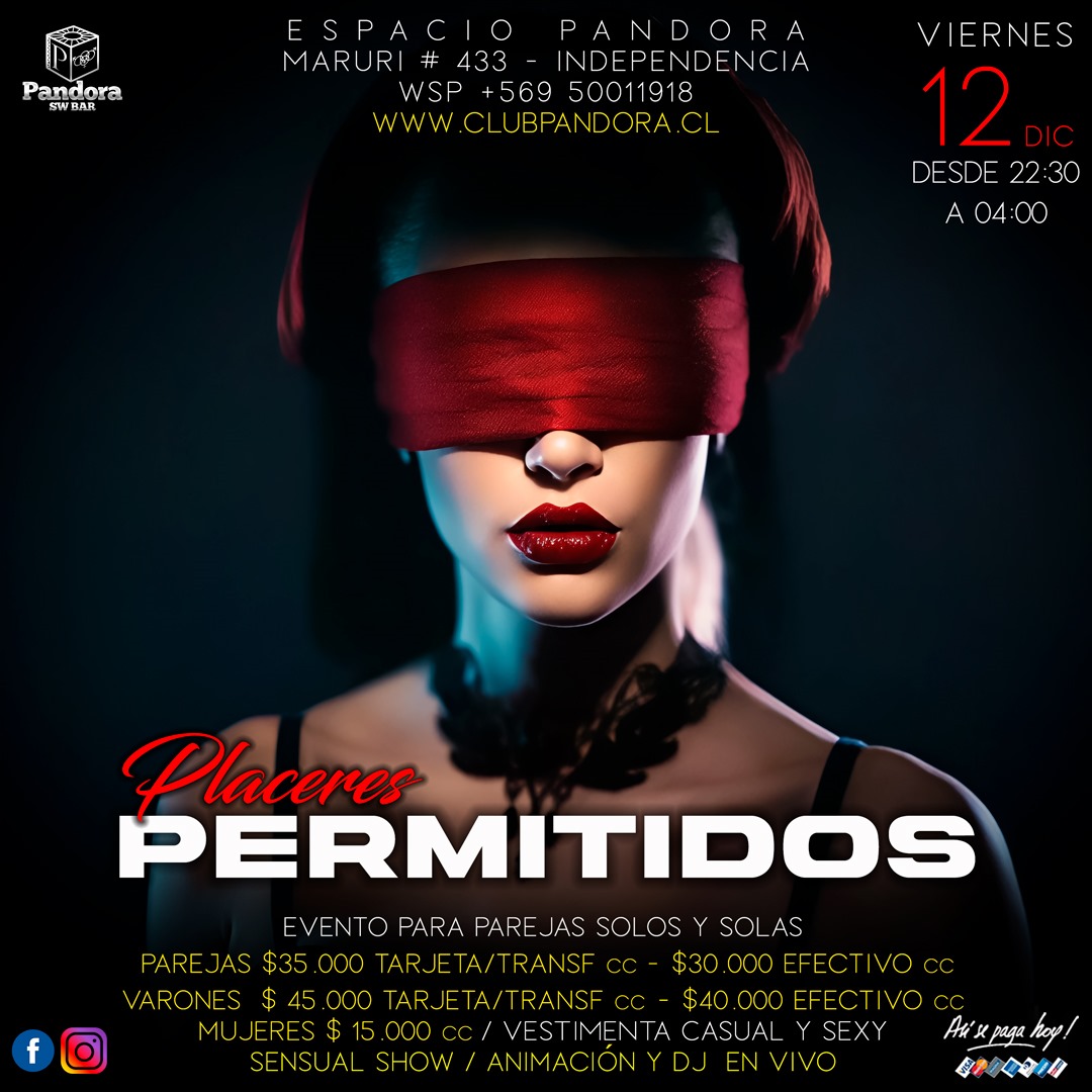 VIERNES 12 PANDORA CLUB BAR TE ESPERA CON UN EVENTO ESPECIAL PARA PAREJAS .SOLOS Y SOLAS ,UNA NOCHE DE * PLACERES PERMITIDOS* RESERVAS SOLO EN NUESTRO WSP +56950011918