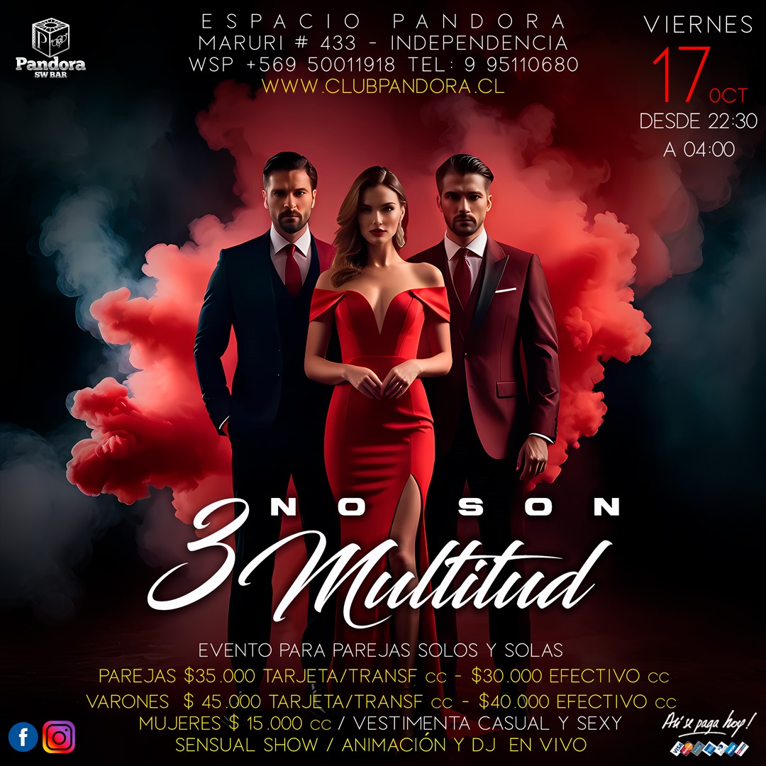 VIERNES 17 …PANDORA CLUB BAR TE ESPERA CON NUESTRO EVENTO *3 NO SON MULTITUD* NOCHE PARA PAREJAS , SOLOS Y SOLAS , HAZ TU RESERVA SOLO EN NUESTRO WSP +56950011918