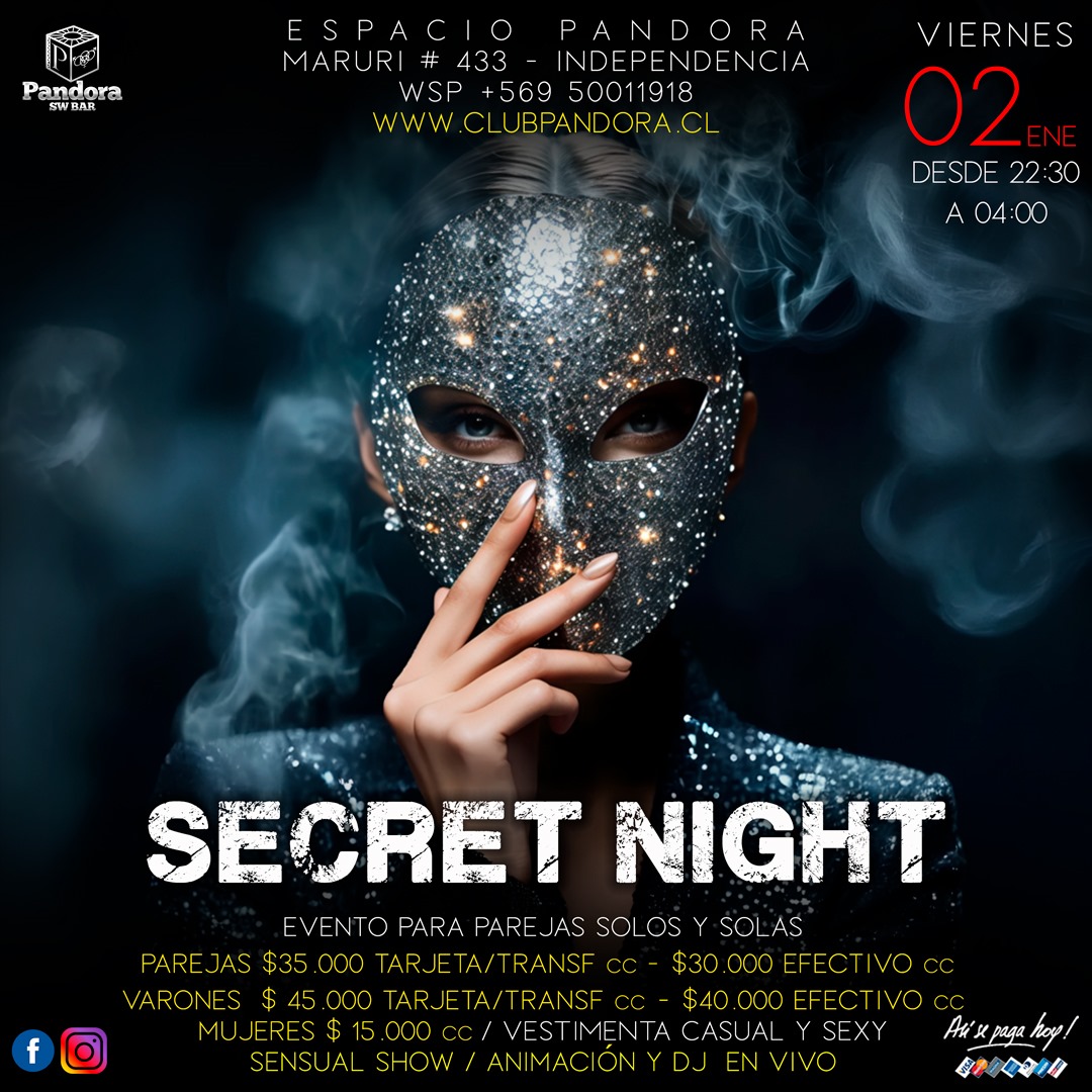 VIERNES 2 DE ENERO , COMENZAMOS EL 2026 CON UN EVENTO ESPECIAL PARA DISFRUTAR ENTRE PAREJAS Y NUEVOS AMIGOS * SECRET NIGHT* RESERVAS SOLO A TRAVES DE NUESTRO WSP 56950011918
