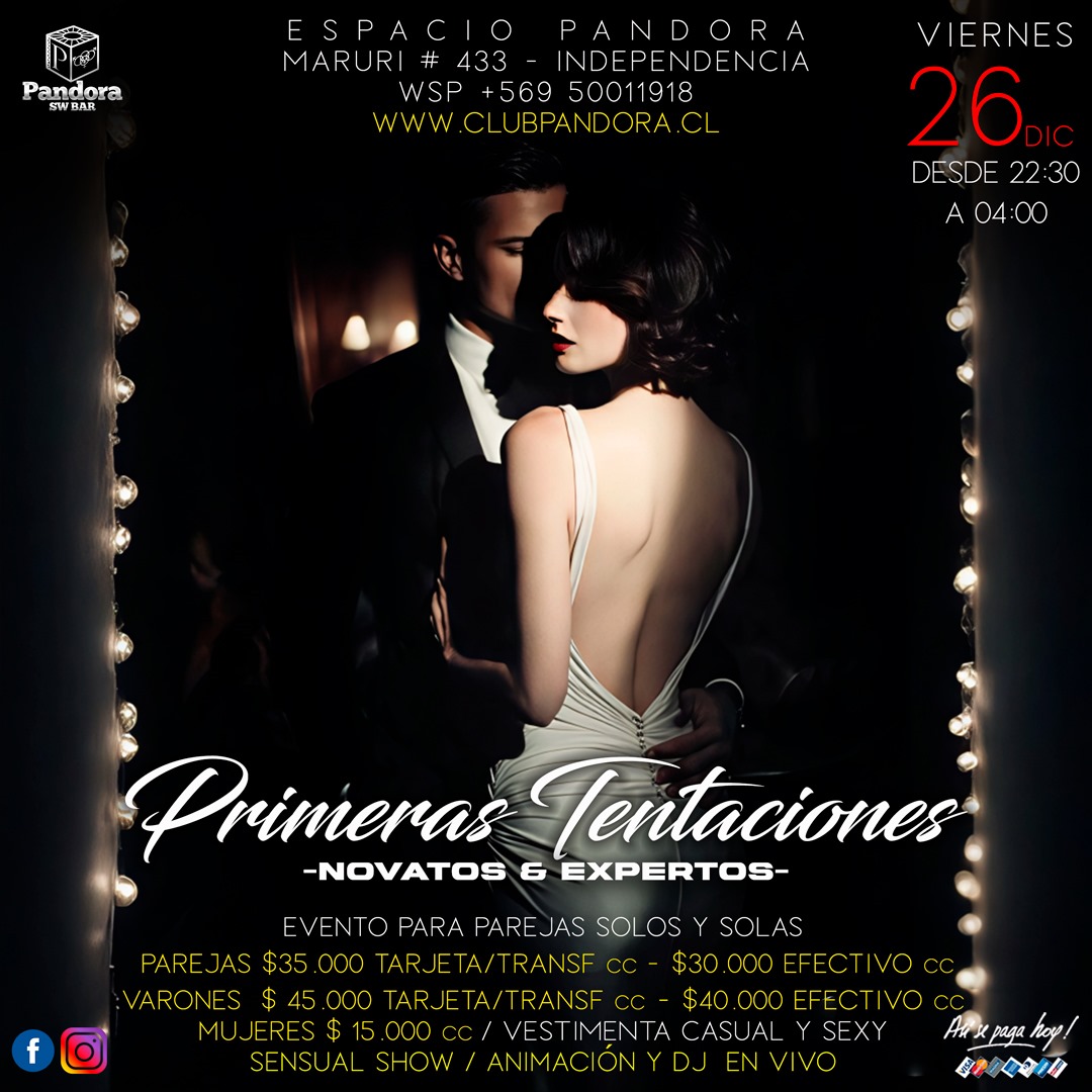 Pandora club bar , te espera este ultimo viernes del año con un evento para parejas , solos y solas que se la juegan , una noche de primeras tentaciones , una jornada de NOVATOS AUDACES Y EXPERTOS EN EL JUEGO. Haz tu reserva solo en nuestro wsp