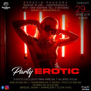 SABADO 29 EVENTO ESPECIAL Y EXCLUSIVO PARA PAREJAS Y CHICAS SOLAS , PANDORA TE ESPERA CON SU EVENTO *PARTY EROTIC* RESERVAS SOLO EN NUESTRO WSP +56950011918