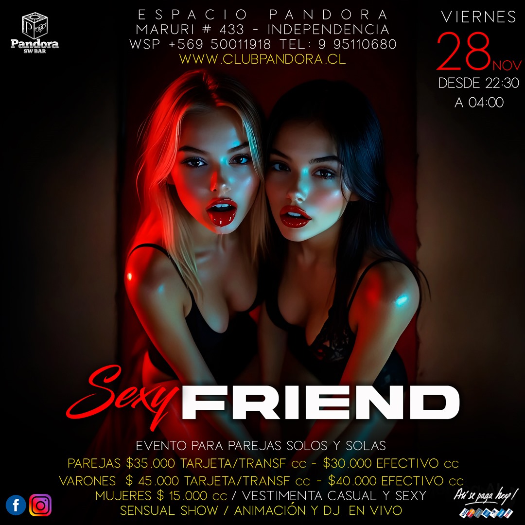 VIERNES 28 , NOCHE PARA COMPARTIR ENTRE PAREJAS Y NUEVOS AMIGOS , TE ESPERAMOS CON NUESTRO EVENTO *SEXY FRIEND* RESERVAS SOLO EN NUESTRO WSP+56950011918