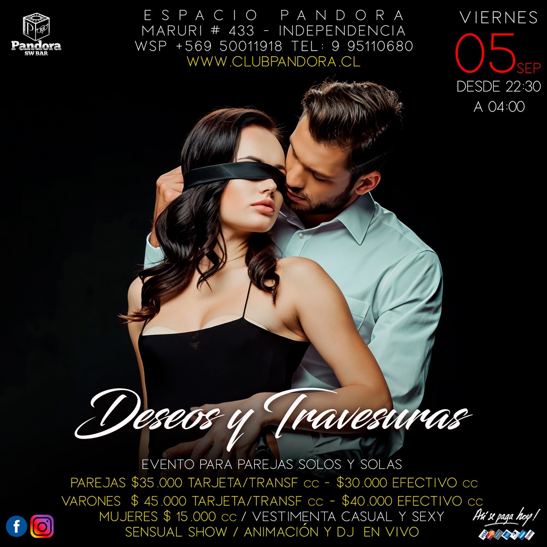 VIERNES 5 DE SEPTIEMBRE ,UNA NOCHE DE *DESEOS Y TRAVESURAS* EVENTOS PARA PAREJAS ,SOLOS Y SOLAS, RESERVAS SOLO EN NUESTRO WSP +56950011918